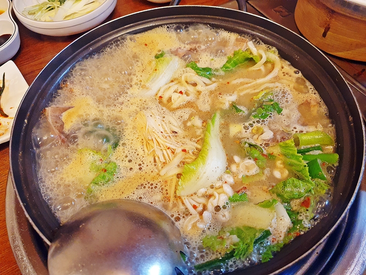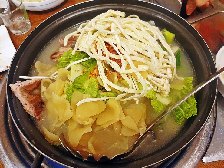 오리전골로 마무리. 인원이 많기 때문에 수제비와 칼국수를 사리로 추가했다. 고소하면서도 은은하게 매운 맛이 나는 이 오리전골은 훌륭한 술안주이기도 하지만 또 해장이 되는 아주 좋은 국물 요리라고 할 수 있다. 육수는 계속 리필이 가능하기 때문에 은은한 불로 계속 끓여 먹는 것이 좋다.