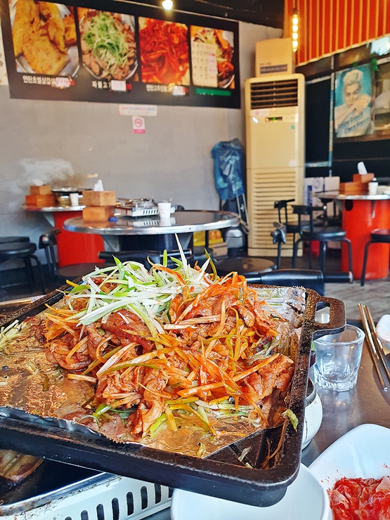 흐름이 끊기지 않게 이번에는 연탄 고추장 불고기를 주문했다. 연탄 고추장 불고기를 먹을 때 좀 취했지만 여지 없이 맛있게 먹었지. 객관적으로 맵지 않은데 나와 동기는 조금이라도 매운 음식을 잘 먹지 못하기 때문에 땀 뻘뻘 흘리며 먹었다. 내 입에는 간장 소스 베이스인 파 불고기가 더 잘 맞았다.