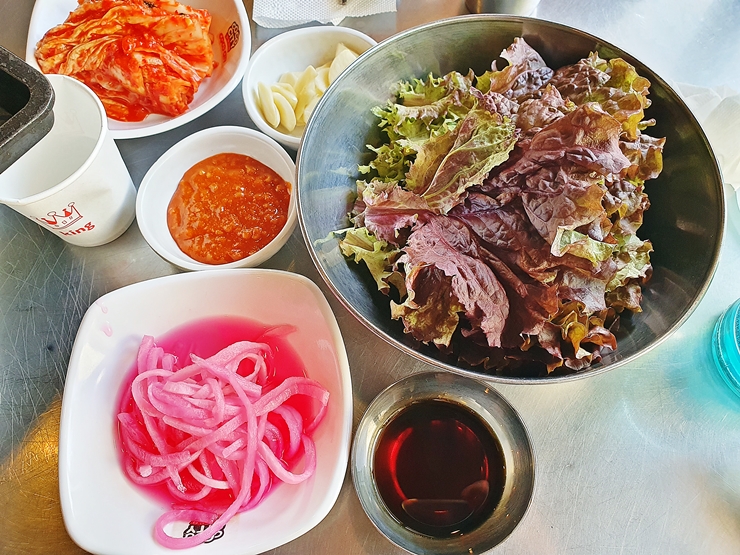 반찬. 요새 금값이라는 상추, 쌈무채, 김치, 마늘, 쌈장과 소스가 나온다. 반찬은 평범한 편인데 소스 맛이 상당히 좋았다. 적당히 달고 짜면서 감칠맛을 함께 느낄 수 있었지. 고기를 먹기 위해서 방문한 것이기 때문에 반찬은 많이 없어도 상관 없다. 고기를 먹을 때는 고기에만 집중을 해야 한다. 그것이 바로 올바른 식습관이다.