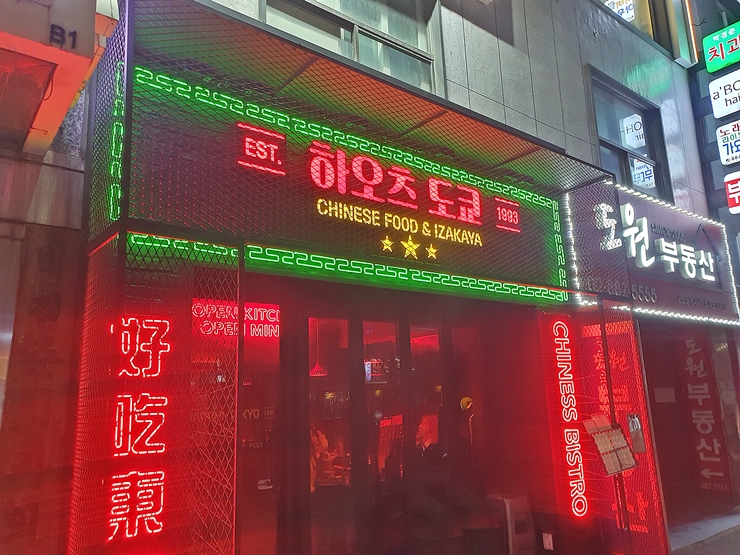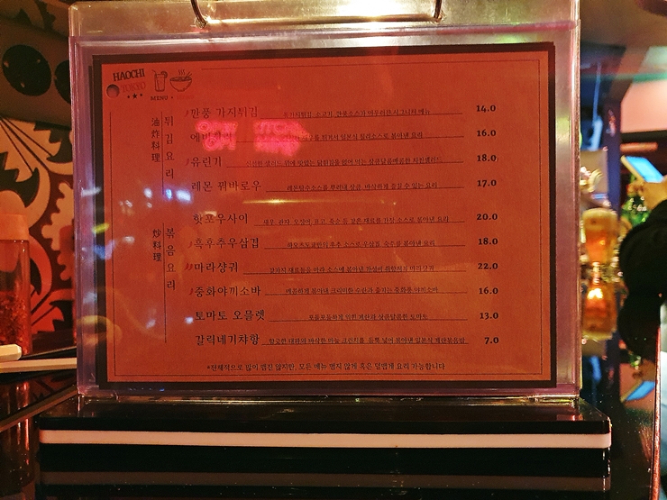 메뉴. 하오츠도쿄의 시그니처 메뉴는 깐풍가지튀김이라고 한다. 그 밖에 유린기나 흑후추우삼겹도 잘 나간다고 한다. 나와 동기는 배가 많이 불러서 무거운 음식은 먹지 못할 것 같아서 중화오이냉채와 백합조개나베를 주문했다. 이 두 개만으로도 소주 한 두 병은 그냥 뚝딱으로 마실 수 있지.