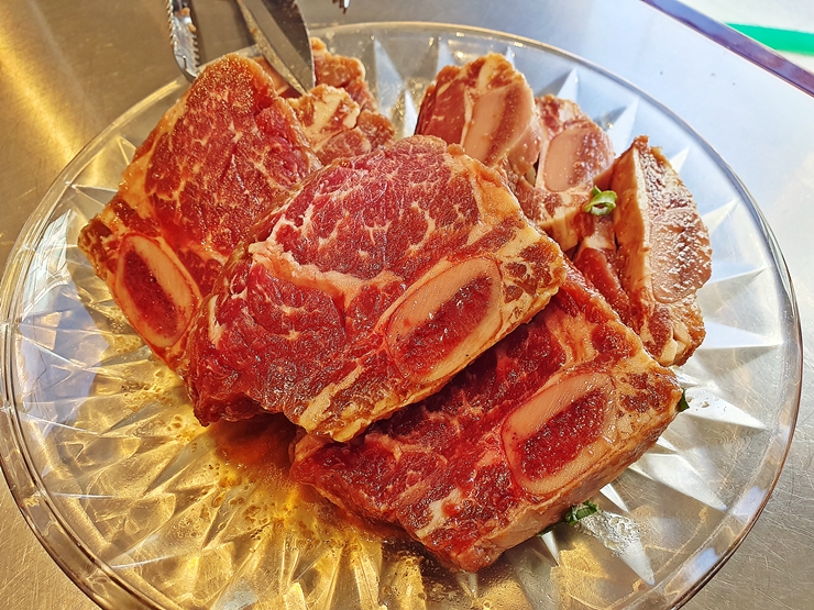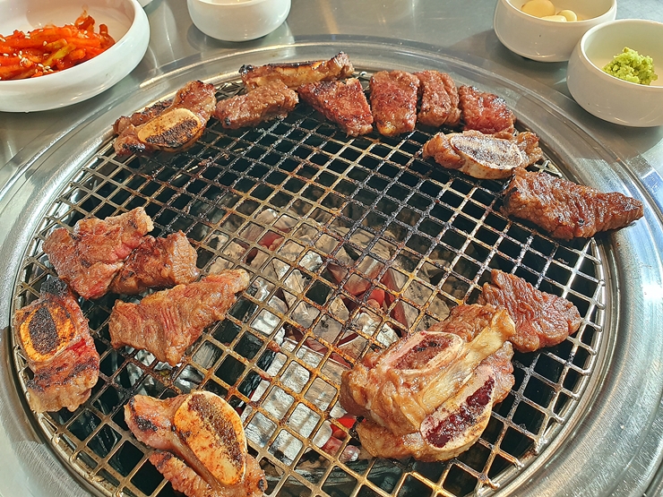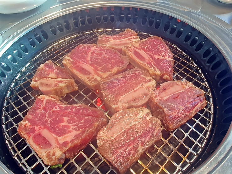 다시 화질이 정상으로 돌아와서 먹다가 LA 양념갈비를 찍었다. 반 정도 먹다가 찍은 것이라서 양이 얼마 없어 보이지만 2인분을 주문하면 적당히 배가 부르게 먹을 수 있는 수준이다. 자, 그럼 이제 신중한 자세로 음미하는 시간을 가져보자. 이 시간은 참으로 행복한 시간이 아닐 수 없다.