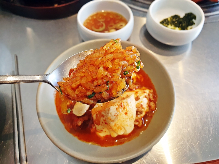 친구 녀석이 순두부 찌개도 하나 주문하자고 해서 그렇게 하자고 했지. 순두부 찌갤를 주문하면 밥이 함께 나오는데 볶음밥이 있기 때문에 밥은 따로 먹지 않았다. 제법 얼큰하게 끓인 순두부 찌개인데 일반적인 순두부 찌개와 맛이 좀 다르다. 뭔가 초피가 들어간 것 같기도 하고, 방아가 들어간 것 같기도 한 맛이다. 익숙하지 않지만 맛있긴 맛있다.