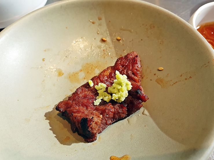 어떤 고기와 잘 어울리는 와사비를 올려서도 맛있게 냠냠 먹어야지. 와사비는 해산물과도 참 잘 어울리지만, 이렇게 고기와 먹는 것이 더 잘 어울린다고 생각한다. 와사비의 맛이 고기의 느끼한 맛을 잘 가려주면서 고소한 맛과 눅진한 맛을 한층 더 높게 올려주기 때문이다.