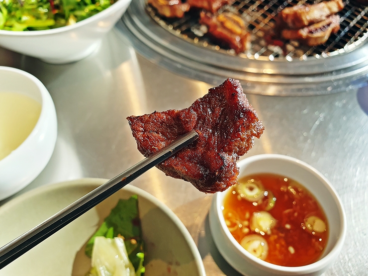 소스를 살짝 찍은 후 맛있게 냠냠. 적당히 달짝지근한 LA 양념갈비의 맛이 참 좋다. 적당히 쫄깃하면서 고소한 맛이 입 안을 가득 채운다. 수원왕갈비도 그렇고 이 LA 양념갈비도 그렇고 평균 이상의 수준 높은 맛을 보여준다. 그래서 인기가 많은 것이겠지.