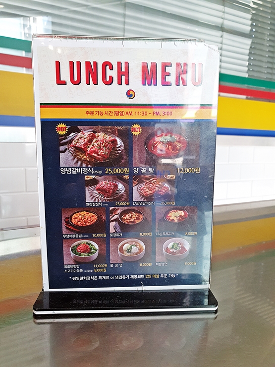 메뉴. 청기와타운에서 가장 잘 나가는 고기는 역시 양념갈비라고 한다. 그 밖에 점심으로 양곰탕, 된장찌개 등도 잘 나간다고 한다. 우리는 고기를 먹기 위해 왔으니 당연히 고기를 주문해야지. 예전 같았으면 바로 3인분을 주문했겠지만 예전만큼 잘 먹지 못하기 때문에 일단 LA 양념갈비 정식 2인분을 주문하고 다소곳하게 앉아 고기가 나오길 기다렸다. 고기를 맞이할 때는 건방 떨지 말고 겸허한 자세로 기다리는 것이 중요하다.