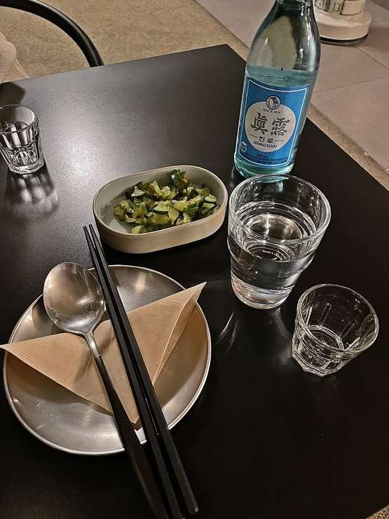 반가운 얼굴을 만났으니 소주를 한 잔 해야지. 오이 무침이 간단한 기본 안주로 나온다. 오이를 극히 싫어하는 사람에게는 더 없이 좋지 않은 안주겠지만 나와 동기 녀석은 오이를 잘 먹기 때문에 훌륭한 소주 안주가 되었다. 오이 무침의 간이 적당해서 자극 없이 먹을 수 있었다.