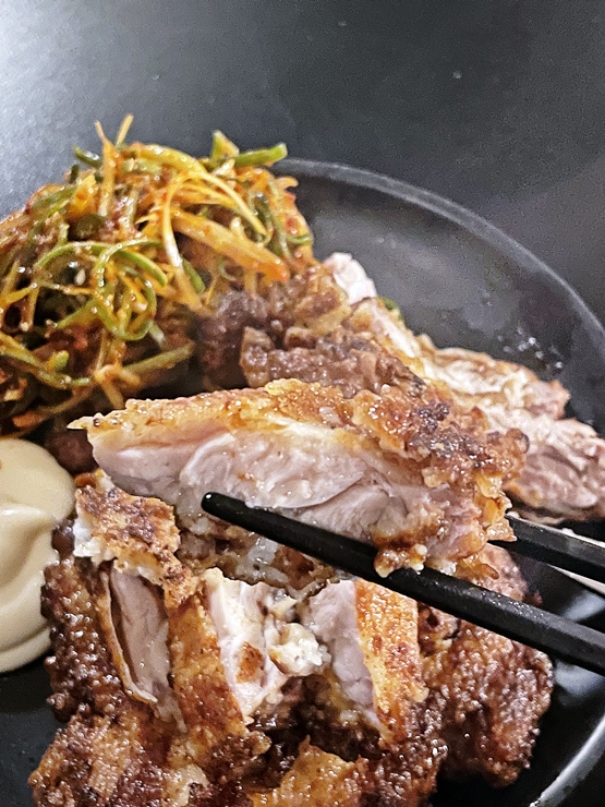 나나 동기 녀석 모두 고기를 좋아하기 때문에 집중적으로 고기를 공략 하기로 했다. 고기를 먹을 때는 이렇게 온전히 고기에만 집중을 해야 다음 날 아쉽지 않고 마음이 가볍기 마련이다. 그래서 다음 안주로 주문한 닭침개. 닭을 넓적하게 정형한 후 부침 가루를 입히고 바삭하고 촉촉하게 잘 구웠다.