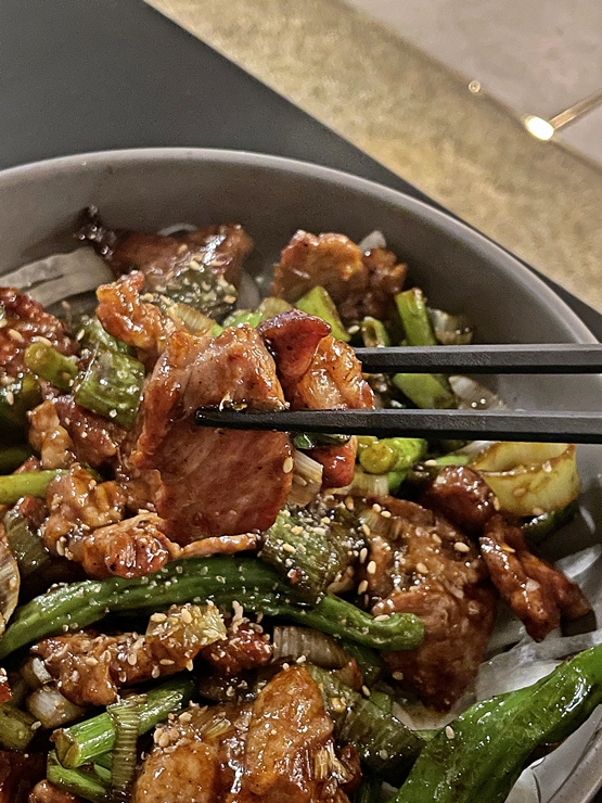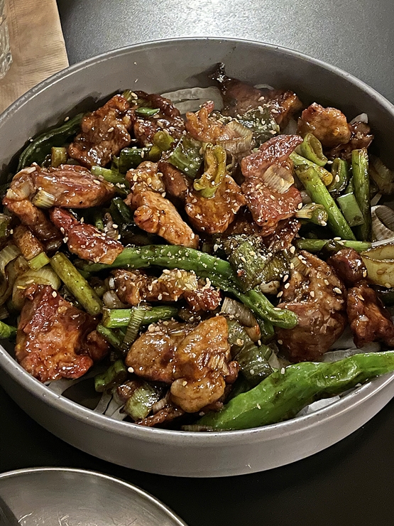 가장 먼저 주문한 불꽃 목살 볶음. 잡내 없는 국내산 암퇘지 1+ 등급 목살을 사용하며 비싼 부위라고 한다. 목살과 함께 꽈리 고추와 마늘쫑을 넣어 볶은 것인데 꽈리 고추의 살짝 매콤한 맛이 목살과 잘 어울렸다. 목살은 간장 소스를 베이스로 했는데 더 없이 훌륭한 소주 안주가 되었다.