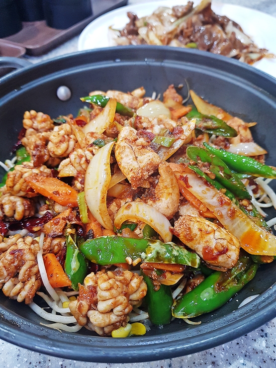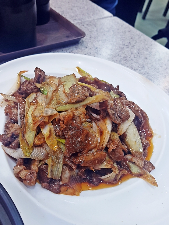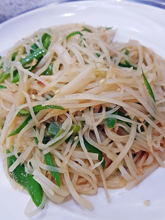감자채 볶음. 채 썬 감자, 고추와 대파를 넣고 잘 볶은 요리다. 언제 어디서나 쉽게 접할 수 있는 흔한 가정식 요리지만 화력이 달라서 그런지 제법 불맛이 나고 맛도 좋았다. 고추가 들어가서 그런지 뒷맛이 살짝 매콤하게 느껴졌는데 신라면보다 맵지 않아 무리 없이 잘 먹을 수 있었다.