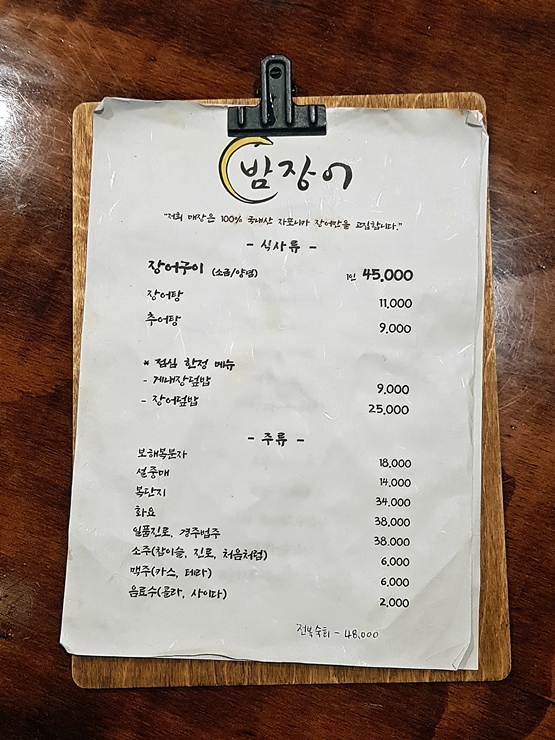 메뉴. 강남 물가를 고려하더라도 요리나 주류 가격은 좀 나가는 편이다. 특히 소주와 맥주가 6,000원인 부분은 상당히 마음 아프게 다가왔다. 흑흑흑. 지방에서는 4,000원에 즐길 수 있는 소주를 2,000원을 더 지불하고 마셔야 하다니. 밤장어의 큰 장점 중의 하나는 바로 콜키지 프리라는 것이다. 위스키도 콜키지 프리인 것은 잘 모르겠지만 와인은 부담 없이 마실 수 있는 장점이 있다. 하지만 이날 우리는 와인을 가지고 오지 않았기 때문에 6,000원이라는 거금을 주고 소주를 마셨지.