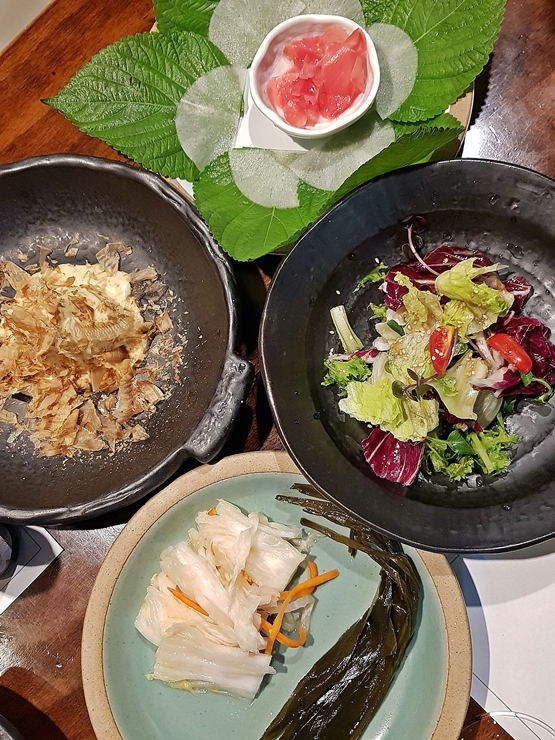 밑반찬. 가쓰오부시를 올린 연두부, 샐러드, 깻잎 쌈무, 명이나물과 백김치가 나온다. 가쓰오부시를 올린 연두부와 샐러드 맛이 상당히 좋았다. 예전 같았으면 장어를 먹을 때 이런 샐러드는 사진만 찍고 지인들에게 모두 양보를 했을 나지만, 이제는 가리지 않고 열심히 잘 먹고 있다. 채소를 많이 먹으면서 살이 빠지지는 않았지만 언젠가는 살이 빠지겠지. 밑반찬이 간소한 편이지만 정성이 느껴지는 맛이기 때문에 잘 먹었다.