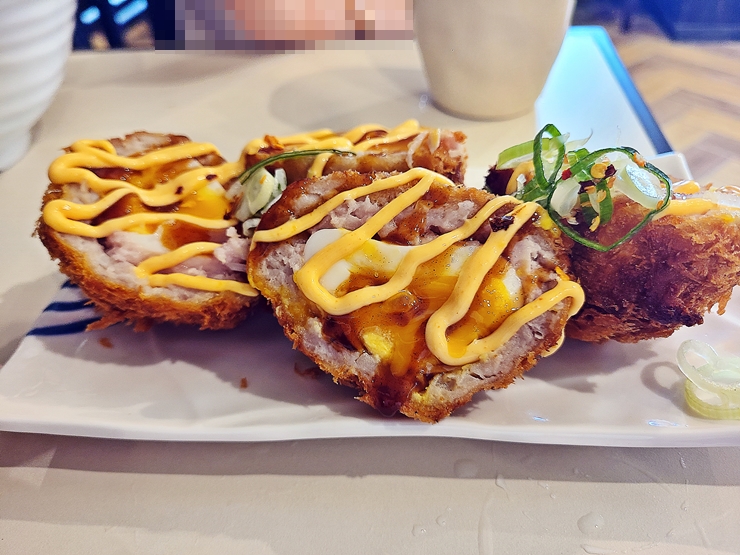 다마고 멘치 까스. 다진 고기 안에 계란을 넣어 튀긴 요리다. 계란이 반숙으로 되어 있어서 부드러운 식감을 느낄 수 있었고 겉은 바삭했다. 멘치 까스에 적절히 간이 되어 있어서 심심하지 않은 맛이다. 다마고 멘치 까스를 먹으니 다시 맥주가 생각났지만 또 꾹 참았다. 아아, 이렇게 확고하게 멋진 나.