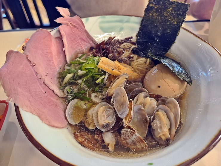 시미지 소유 라멘. 차슈, 죽순, 파, 다시마, 바지락, 김과 반숙 계란이 들어 있는 라멘이다. 내가 주문한 것이 아니라서 사진만 찍고 맛을 보진 못했다. 비교적 깔끔한 스타일의 라멘이라고 한다.