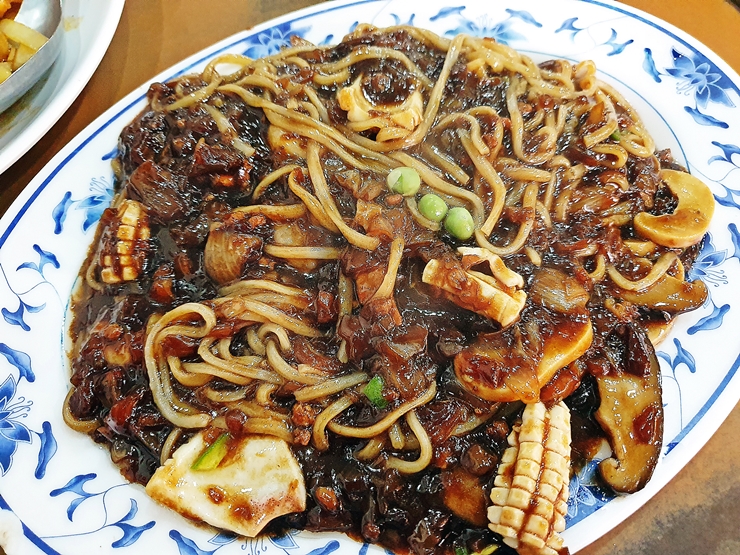 쟁반짜장. 일반 짜장에 부재료를 더 넣은 후 한 번 볶아서 나온 것이다. 일반 짜장에 비해 굉장히 양이 많다. 예전의 식성을 생각해서 무리 없이 다 먹을 거라 생각했는데 겨우 다 먹고 말았다. 일반 짜장에 비해 기름이 더 들어가서 느끼하고 진한 맛이 특징이다. 사진에는 나와 있지 않지만 잘게 썬 고추가 들어 있어서 느끼함을 잘 잡아준다.