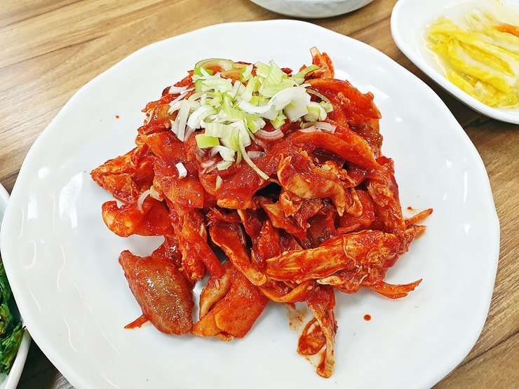 닭고기 무침. 닭고기를 새콤달콤한 소스에 무쳐서 제공한다. 소스에 겨자를 살짝 넣어서 그런지 뒷맛이 매콤하다. 식욕을 돋우기에 상당히 좋은 음식이었다. 이 역시 훌륭한 소주 안주인데 소주를 마시지 못하는 컨디션이 아쉬웠다. 다음에 가게 된다면 건강한 몸으로 방문을 하도록 해야지.