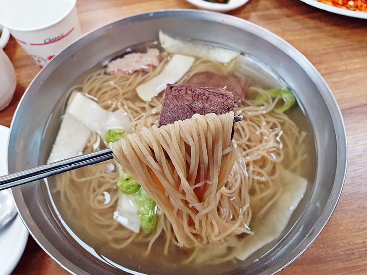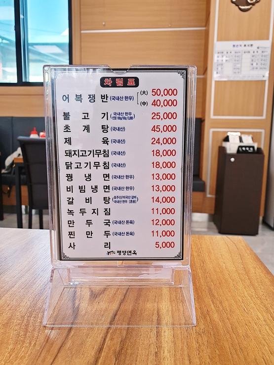 메뉴. 어복쟁반, 불고기, 초계탕, 제육, 돼지고기 무침, 닭고기 무침, 꿩냉면, 비빔냉면, 갈비탕, 녹두지짐, 만둣국과 찐만두를 판매하고 있다. 꿩냉면은 평양냉면인데 꿩고기가 들어가는 것이 특징이라고 한다. 우리는 꿩냉면과 닭고기 무침을 주문했다.