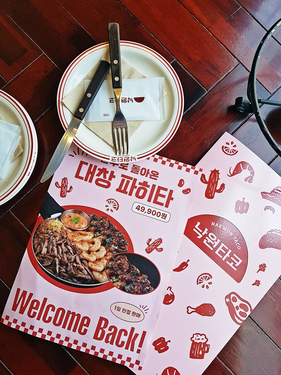 최근 공격적인 영업과 마케팅을 통해 전국 각지에 많은 지점을 늘리고 있는 낙원타코. 대창을 이용해서 만든 대창 파히타로 유명하다. 개인적으로 대창은 구워 먹는 것을 가장 좋아하지만 일단 비주얼이 궁금하기도 했고, 다른 음식들도 즐기기 위해서 한 번 찾아가기로 했다.