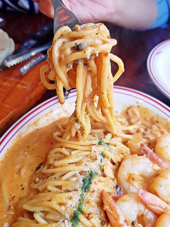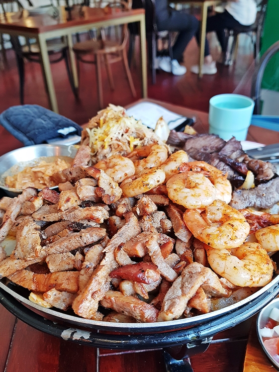 아름다운 낙원 파히타의 모습. 구운 목살, 부채살과 새우의 구성이다. 양이 상당히 많기 때문에 보통의 식사량을 가진 사람이라면 파히타 하나만 주문하더라도 두 명은 충분히 먹을 수 있다. 파스타의 경우 세 명부터 주문할 것을 추천한다.