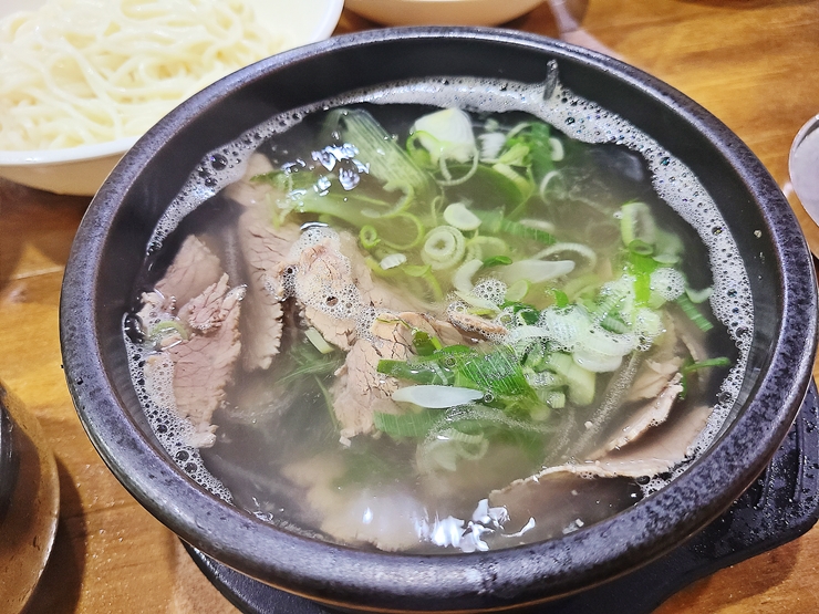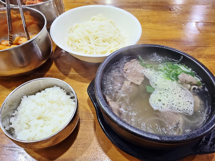 빠르게 나온 양지 국수. 동남집은 사리를 일반 사리와 비빔 사리 두 가지가 있는데 혼자 가거나 두 명이 갈 때는 하나만 먹으면 충분하다. 세 명이 갈 경우는 일반 사리 하나와 비빔 사리 하나를 주문하면 좋다. 그냥 내 느낌인지 잘 모르겠지만 밥 양은 가산디지털단지에 있는 동남집에 비해 극히 적은 것 같았다. 뭐, 어차피 사리를 넣어 먹을 거니 밥은 이 정도로도 충분하다.