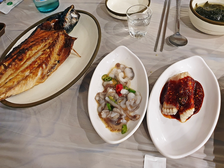 가장 먼저 나오는 고등어 구이, 산낙지, 가자미 조림. 예전에는 볼락이 나왔는데 지금은 고등어로 바뀌었다. 가격은 그대로인데 물가 인상을 따라가지 못 해서 생선 종류를 바꾼 것 같다. 산낙지는 산낙지 맛이고 고등어는 겉은 바삭하고 속은 촉촉하게 잘 구웠다. 가자미 조림은 양념이 자극적이지 않다. 이 것들만 있어도 일단 소주 각 일 병은 가볍게 마실 수 있다.