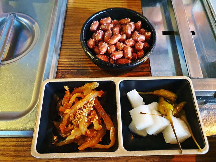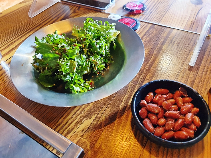 밑반찬. 치커리 샐러드, 땅콩, 짜사이와 피클이 제공된다. 치커리 샐러드는 새콤달콤한 맛이라고 했는데 내 입에는 굉장히 신 맛이 강했다. 살짝 맛을 본 후 신 맛이 강한 치커리 샐러드는 친구의 건강을 위해서 모두 양보했다. 내 주변의 좋은 사람들의 건강까지 생각하는 배려심 가득한 멋진 나의 모습.