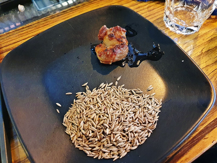 돼지 등심을 두드린 후 잘 펴서 만들었다. 반죽에서 오징어 먹물 맛이 느껴지진 않지만 겉은 바삭하고 속은 촉촉하다. 칠리 소스에서 살짝 매운 맛이 느껴지는데 인위적인 캡사이신의 맛은 아니다. 이 또한 훌륭한 술 안주라 할 수 있다.