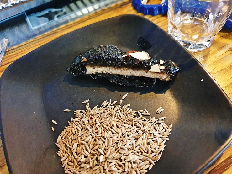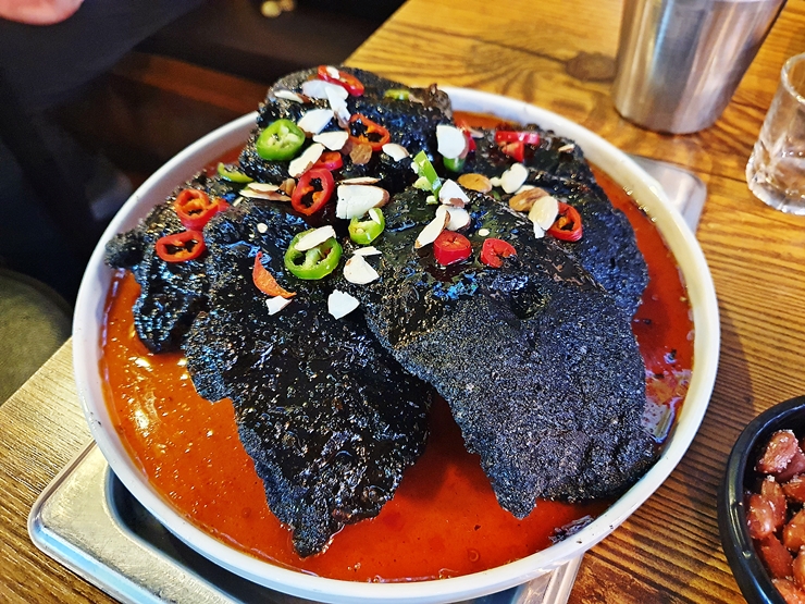 블랙 꿔바로우. 비주얼이 상당히 인상적이다. 무엇으로 만들었는지 물어보니 오징어 먹물을 이용해서 만들었다고 한다. 일반적인 꿔바로우와 다르게 블랙 꿔바로우는 칠리 소스를 베이스로 하고 있다. 비주얼은 합격점이니 이제 맛이 있으면 더 할 나위 없겠다.