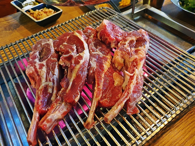 익기까지의 중간 과정은 생략하고 대충 익은 모습의 양갈비. 양갈비는 오래 구울 경우 질겨지기 때문에 적당히 익을 때 먹는 것이 부드러운 식감을 잘 느낄 수 있어서 좋다. 개인적으로는 미디움으로 구워 먹는 것을 선호하는 편이다. 사진을 찍은 후 조금 더 익힌 후 양갈비를 먹기로 했다.