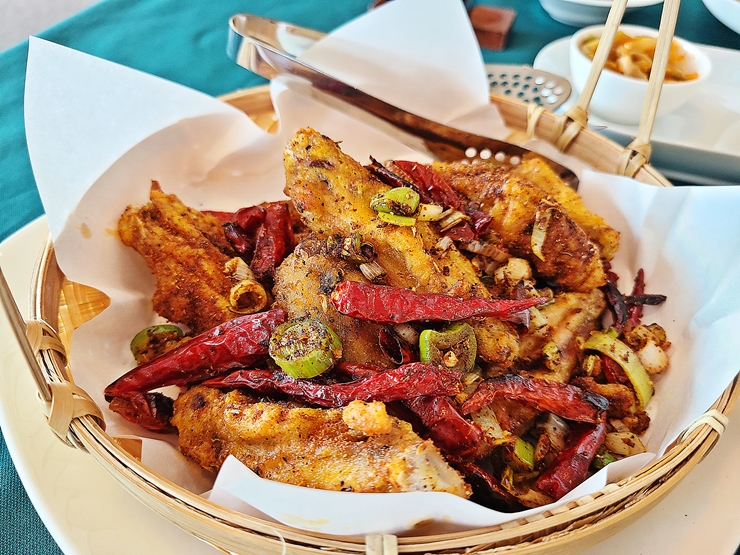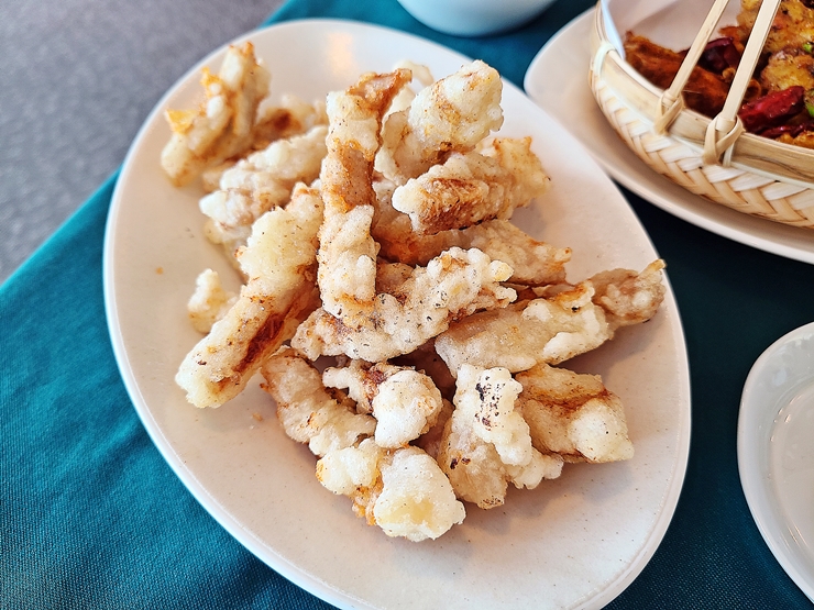 마늘 소스 닭 날개 튀김. 마늘 소스를 사용했다고 하지만 라즈지에 가깝다. 마늘, 화자오와 고추가 상당히 많이 들어갔는데 화자오 특유의 향과 맛이 상당히 강하게 난다. 이 향과 맛에 익숙한 나는 맛있게 잘 즐겼는데 같이 간 일행은 익숙하지 않아 거의 못 먹었다. 덕분에 내가 대부분의 닭 날개를 먹을 수 있었다.