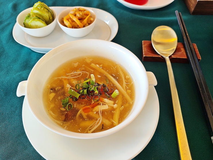 오늘의 스프. 게살이 살짝 들어있고 죽순과 버섯도 들어있다. 삼삼한 맛일 거라 생각했는데 제법 맛이 진했다. 스프 위에 뿌려진 소량의 라유가 밸런스를 잘 잡아준다.