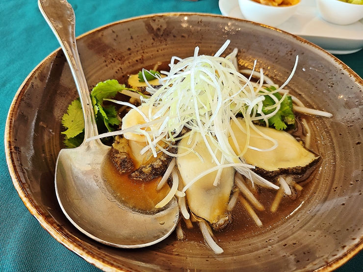 전복간장. 간장 소스 베이스에 잘 찐 전복을 놓고 파채, 숙주와 고수로 데코레이션을 한 요리다. 간장 소스를 베이스로 요리를 했음에도 불구하고 간이 짜지 않고 상당히 깔끔한 맛을 보여준다. 고수를 썰어 넣은 것이 아니라 고수 잎 그대로를 다 넣었는데 고수를 싫어하는 사람도 편하게 먹기 위한 것 같다. 고수 잎만 빼고 먹으면 맛있게 먹을 수 있으니 말이다.