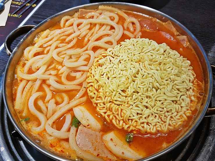 점심 시간에는 언제나 붐비는 곳이기 때문에 점심 시간을 살짝 지난 후 만나기로 했다. 그런데도 자리가 한 자리 밖에 남아 있지 않아서 빠르게 자리에 착석했다. 착석 후 부대찌개 2인분과 모둠, 우동 사리를 추가했다.