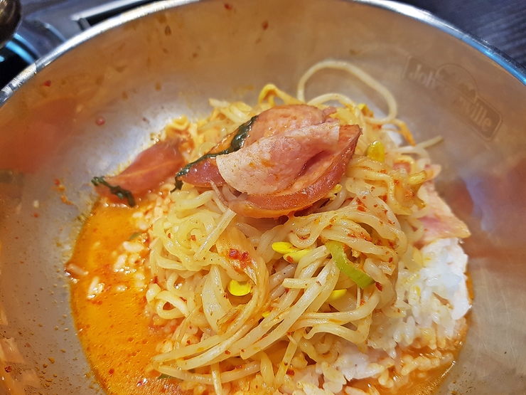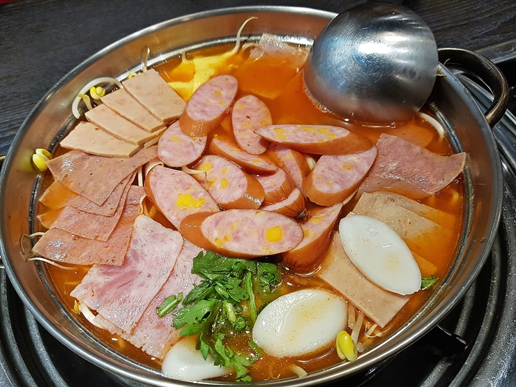 드디어 나온 부대찌개. 지금 봐도 정말 아름다운 모습이 아닐 수 없다. 소시지와 햄은 모두 쟌슨빌 상품만 사용한다. 쟌슨빌 소시지는 언제 먹어도 맛있다.