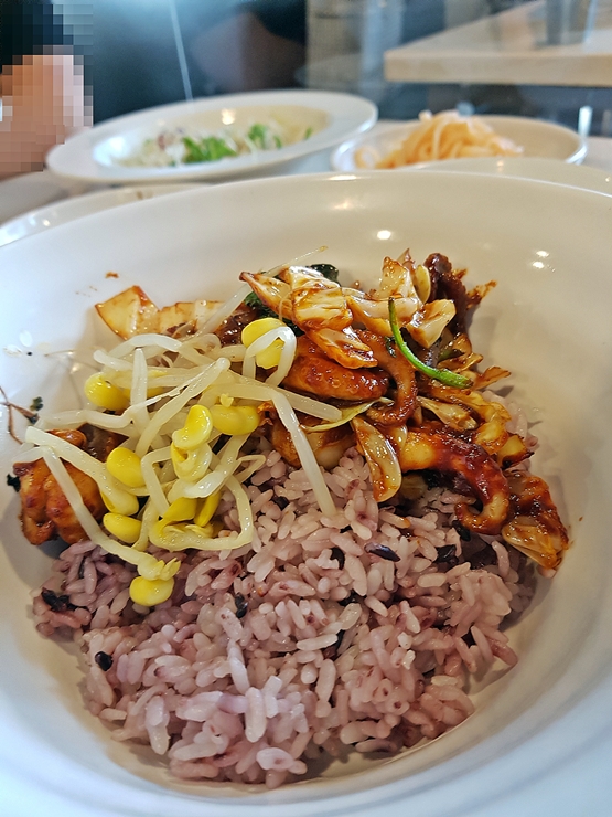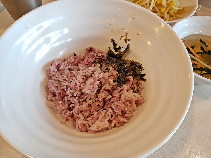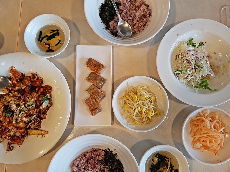 밥은 큰 대접에 담겨 나온다. 쭈꾸미를 넣어 비벼 먹으라는 뜻이다. 밥은 흑미를 섞어 지은 흑미밥이고 소량의 김과 참기름이 들어있다.