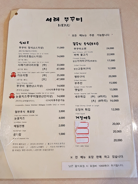 짝꿍이랑 서래마을에서 맛있는 것을 먹으며 하하호호 놀았다. 짝꿍이랑 빙수와 밀푀유 등을 먹다가 점심을 먹기 위해서 찾아간 서래 쭈꾸미. 점심에는 쭈꾸미 정식을 주로 판매하고, 저녁에는 철판 구이를 판매하는 곳이다.