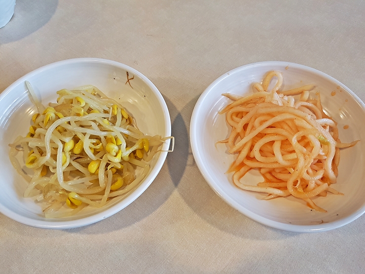 콩나물과 무절임. 밥에 넣어 쭈꾸미와 함께 비벼 먹어도 되고 그냥 반찬으로 따로 냠냠 먹어도 된다. 개인적으로 콩나물은 비벼 먹는 것을 좋아하고 무절임은 따로 먹는 것을 선호하는 편이다.