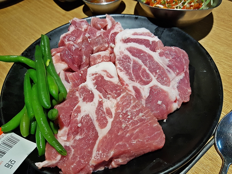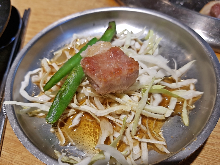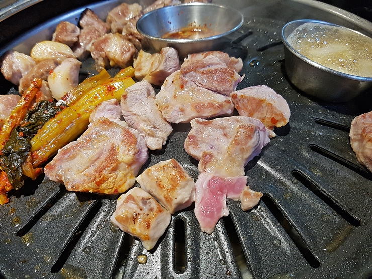 고기를 먹을 때 흐름이 끊기는 것만큼 위험하고 위태로운 일이 없기 때문에 목살을 다 먹기 전에 특고기도 구워준다. 어서 빨리 구워져라. 나의 절실한 기도 덕분인지 빠르게 구워지고 있는 모습이다. 정성껏 구워준 후 맛을 보기로 한다. 아쉽게도 잘 구워진 특고기 사진은 먹기 바빠서 찍지 못했는데 특고기 역시 담백하고 고소한 맛이 잘 느껴졌다. 목살만큼이나 참 맛있게 잘 즐겼다. 서울 고속버스터미널 근처, 잠원동에서 맛있는 돼지고기를 즐기고 싶을 때 한 번 가볼 것을 강력하게 추천하는 곳이다.