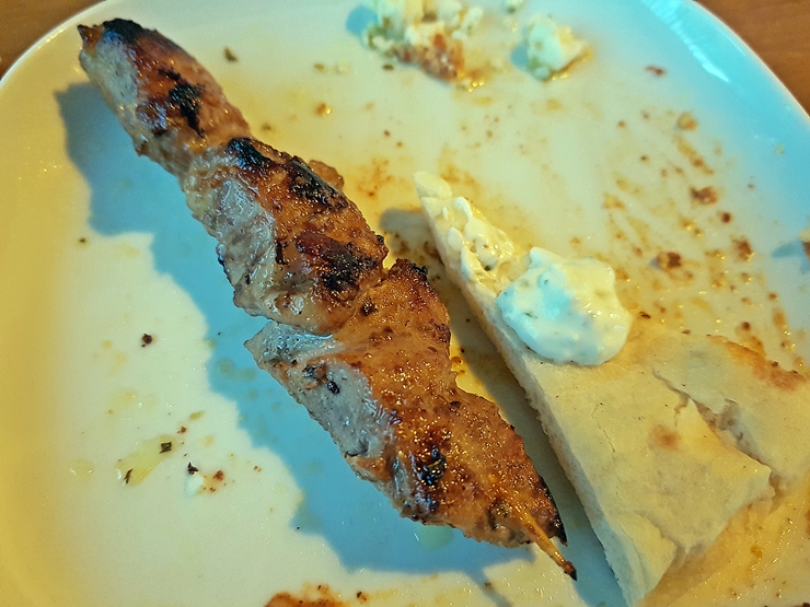 아름다운 수블라키의 모습. 고기를 먹을 때는 고기만 먹어야 하지만 이 날은 특별히 피타빵과 함께 즐겼다. 수블라키는 살짝 느끼한 편이라 함께 제공되는 차지키 소스와 먹으면 느끼한 맛을 없앨 수가 있다. 짝꿍이 배가 부르다고 해서 남은 수블라키는 내가 다 냠냠 먹었다. 그리스 음식을 그리 많이 접하지 못해서 큰 기대를 하지 않고 찾아갔는데 나올 때는 굉장한 만족감을 느끼고 나왔다. 방배동에서 수준 높은 그리스 음식을 즐기고 싶다면 꼭 한 번 가볼 곳으로 추천하는 곳이다.
