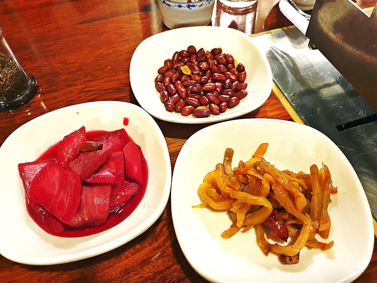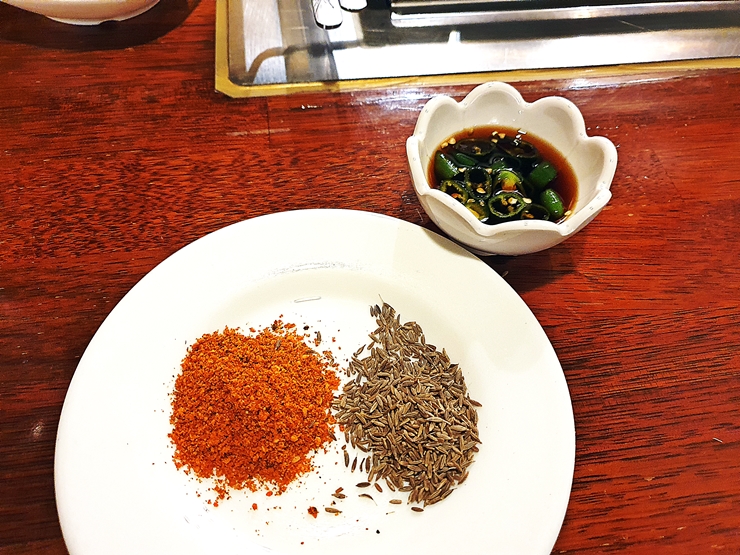 반찬. 양고기를 판매하는 곳에서 가장 흔하게 볼 수 있는 땅콩, 짜사이와 피클이 나오고 양고기와 함께 즐길 수 있는 소스, 쯔란과 고춧가루가 있다. 나는 쯔란을 굉장히 좋아하기 때문에 사진을 찍은 후 그릇에 수북하게 담아서 맛있게 즐겼다.