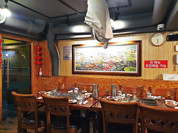 용산양꼬치는 1층과 지하에 좌석이 있는데, 우리는 지하로 자리를 배정 받았다. 우리 옆 테이블에는 회식을 하는 고객들이 있어서 제법 시끄러웠다. 개인적으로 조용한 분위기를 좋아하는데, 이날은 상대적으로 많이 시끄러워서 귀가 좀 아팠지만 막상 양다리 구이의 먹을 때는 양다리에 집중해서 그런지 그런 시끄러운 소리가 전혀 들리지 않았다.