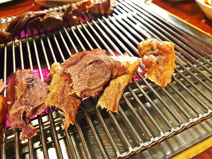 참으로 아름다운 통양다리 구이. 양다리는 그 두께가 굉장하기 때문에 약한 불로 은은하게 오래 구워야 한다. 양다리는 이미 한 번 구워 나왔기 때문에 서걱서걱 먹기 좋은 사이즈로 자른 후 맛있게 냠냠 먹으면 된다. 양다리의 경우 직원이 직접 집도를 해주기 때문에 편안하게 즐기면 된다.