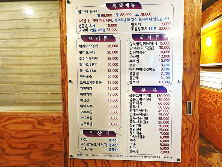 메뉴. 용산양꼬치의 시그니처 메뉴라고 할 수 있는 양다리 통구이가 가장 먼저 적혀 있고 그 밖에 양갈비, 향라바삭꽃게, 향라오징어, 삼선누룽지탕, 꿔바로우, 경장육슬, 가지튀김, 지삼선, 마파두부, 고수무침, 오이무침, 숙주볶음과 볶음밥 등을 판매하고 있고 금문고량주 양하대곡과 공부가주 등 다양한 백주도 갖추고 있다.