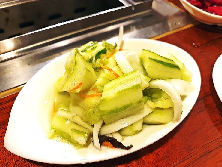 서비스로 받은 오이무침. 오이무침과 파이황과는 굉장히 유사한 음식이다. 만드는 방법은 거의 동일하나 오이무침은 오이의 껍질을 벗긴 후 그대로 무쳐서 나오는 것이고, 파이황과는 오이 껍질을 벗기지 않고 방망이 등으로 오이를 내려친 뒤 양념을 무친 것이다. 어차피 맛은 거기서 거기이니 알아서 잘 골라서 먹도록 하자.