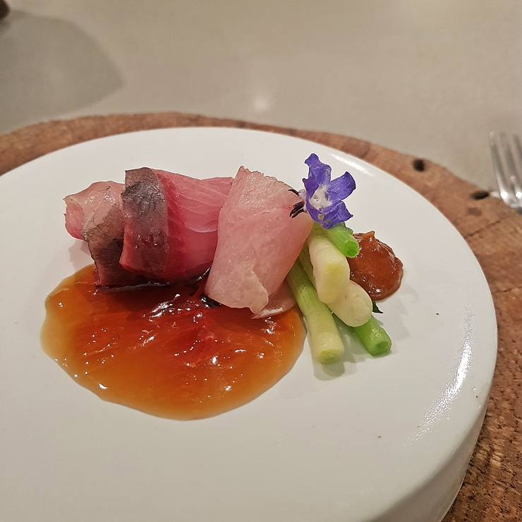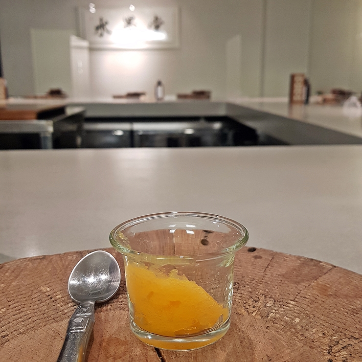 네 가지 제철 작은 한입들. 제철에 따라 구성은 바뀐다고 한다. 오래 되어 기억이 잘 나지 않지만 단새우 크래커, 땅콩 무스크림 김부각, 퍼프 페스츄리와 홍시 묵이 나왔던 것 같다.