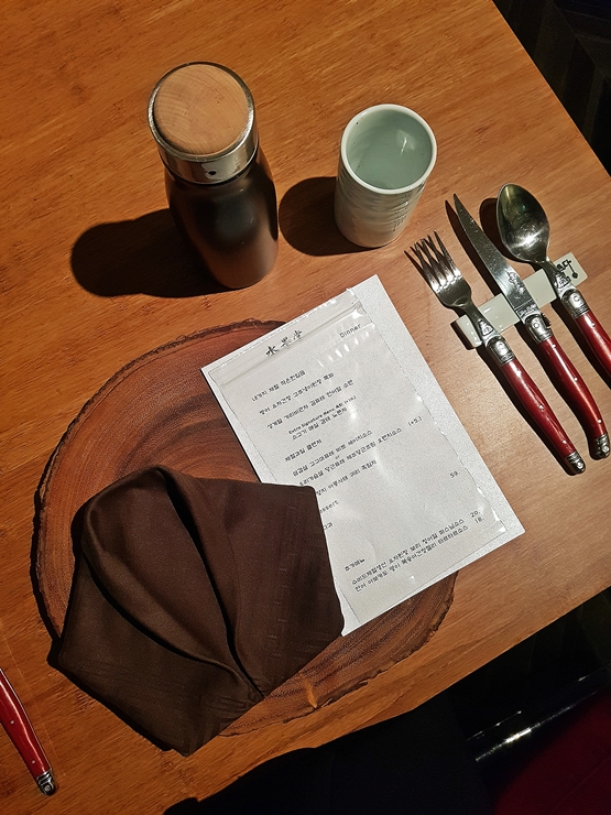 메뉴. 수묵당은 저녁 8코스로 제공이 되고, 점심 6코스로 제공이 된다. 이 날은 저녁으로 냠냠 맛있게 즐겼지. 가격이 합리적이어서 점심, 저녁 어느 시간에 가더라도 큰 부담이 없다.
