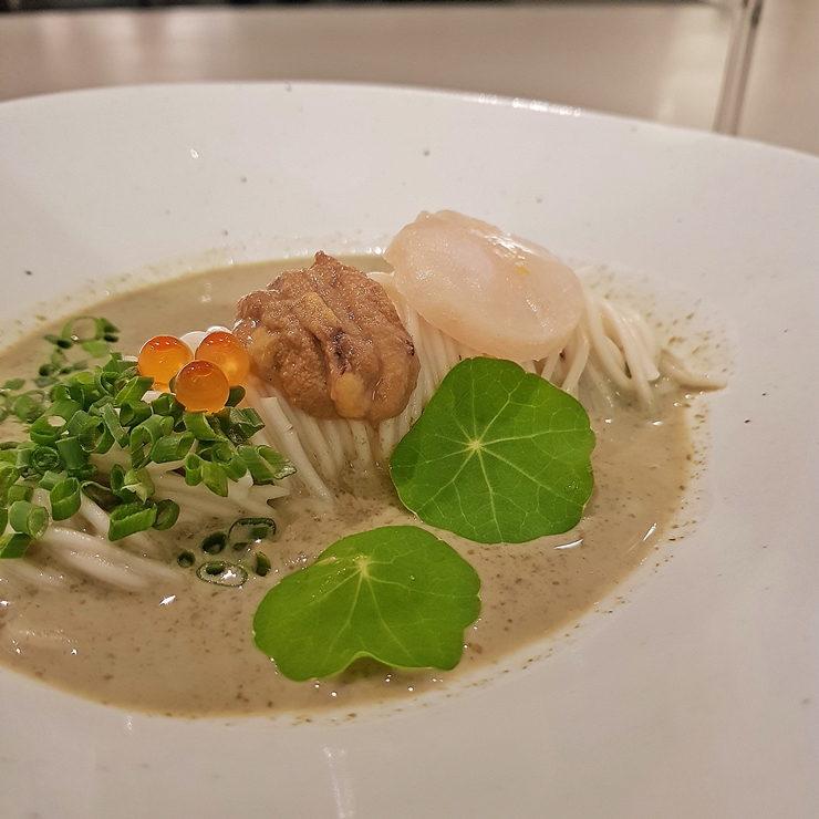 김퓨레 소면. 연어알, 성게알, 쪽파와 가리비 관자가 들어있다. 퓨전 한식을 표방해서인지 면 요리가 파스타가 아닌 소면이 나오는 것이 흥미롭다. 소면의 삶기가 적당해서 심이 살아있거나 퍼진 느낌이 전혀 들지 않았다. 김을 갈아 만든 퓨레는 진한 고소한 맛을 느낄 수 있다.
