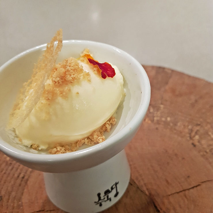 디저트. 아이스크림과 판나코타가 나온다. 판나코타는 이탈리아식 스위트 푸딩인데 이를 한식으로 재해석해서 만들었다. 내가 아이스크림이나 푸딩 같은 단 음식을 별로 좋아하지 않기 때문에 한 입만 먹었다. 같이 간 지인은 아주 만족스럽게 냠냠. 비교적 합리적인 가격으로 다양하고 맛있는 퓨전 한식 요리를 즐길 수 있는 수묵당. 콜키지 프리인 것이 굉장히 매력적인 요소다. 퓨전 한식을 먹고 싶다면 한 번 방문할 것을 추천하는 곳이다.