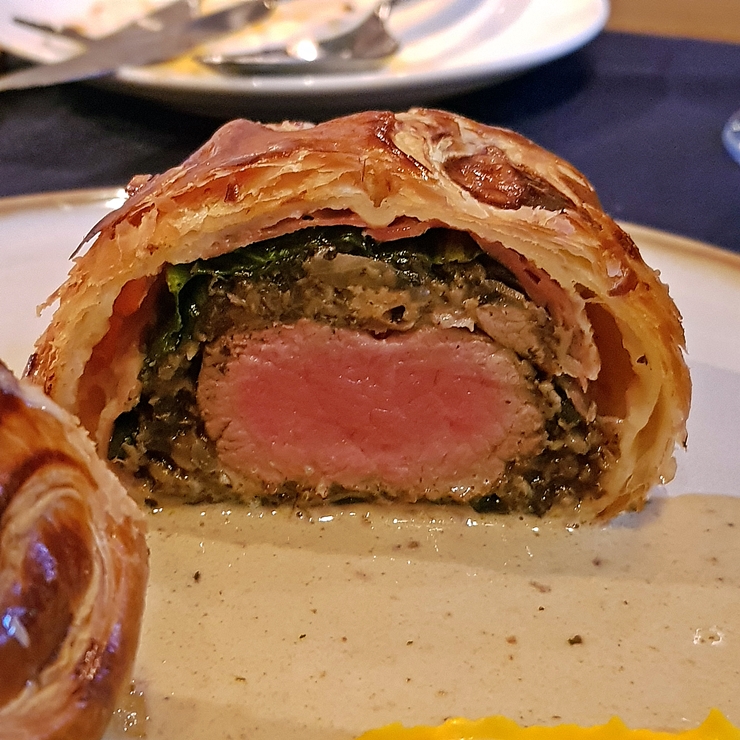 미디엄으로 잘 익은 소고기. 바삭하게 구워진 페이스트리 안에 안심, 버섯과 시금치가 들어있다. 야무지게 한 입에 다 먹고 싶었지만 좀 커서 반으로 잘라 소스를 찍은 후 신중하게 맛을 음미하기로 했다. 부드럽게 익은 안심의 식감이 잘 느껴지고 씹는 맛이 좋다. 안심 특유의 고소한 맛도 잘 느껴진다. 익힘도 익힘이지만 소스도 기가 막히다. 느끼하지도 않고 밋밋하지도 않다. 굉장히 밸런스가 잘 맞는 소스다. 파스타에 이어 맛있는 비프 웰링턴까지 즐기니 굉장히 좋았다.