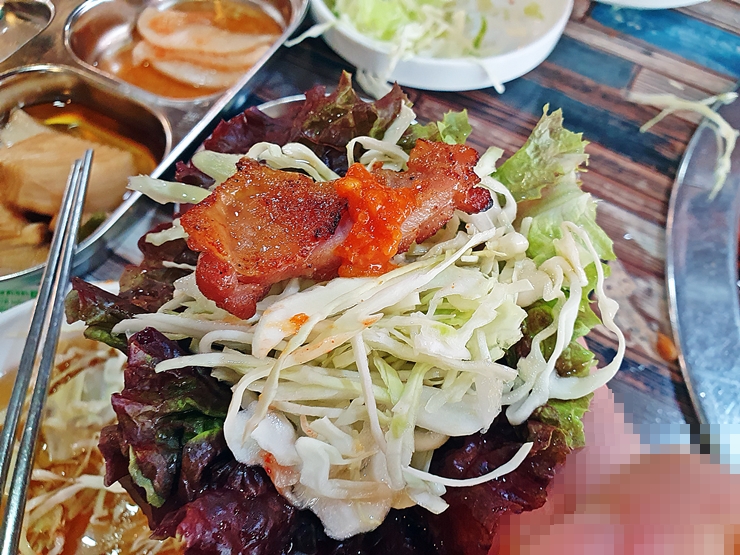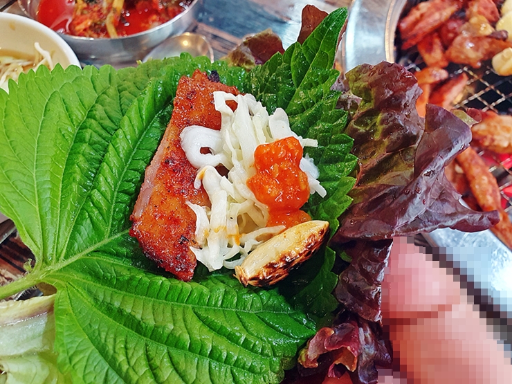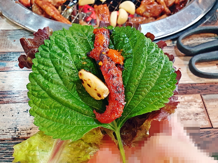우선 목살부터. 짝꿍이 채소를 많이 먹으라고 해서 상추와 깻잎과 함께 열심히 쌈으로 먹었다. 역시 짝꿍 말을 잘 드는 멋진 남자친구인 나. 목살은 퍽퍽하지 않고 부드러운 식감이 특징이었다. 목살은 고추장 양념으로 되어 있는데 생각보다 맵지 않았다.