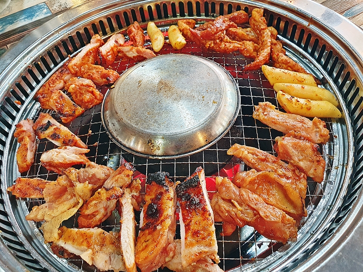 실로 아름다운 닭갈비의 모습. 닭갈비와 함께 밀떡이 조금 같이 나온다. 난 떡을 많이 좋아하지 않지만, 이렇게 닭갈비와 함께 구워 먹으면 그 맛은 각별하다. 닭갈비는 초벌이 되어 나오기 때문에 오래 구울 필요 없이 살짝 구워서 맛있게 먹으면 된다.